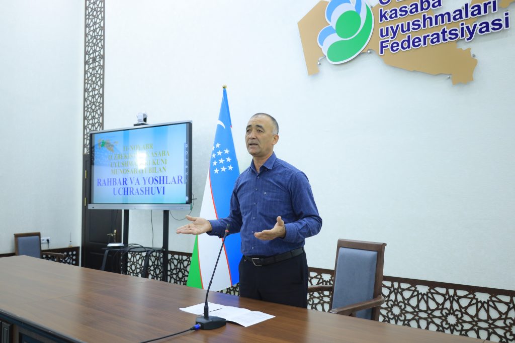 Ўзбекистон касаба уюшмалари ҳаракатининг 120 йиллик юбилейи ҳамда “11 ноябр — Ўзбекистон касаба уюшмалари куни” байрами муносабати билан Ўзбекистон касаба уюшмалари Федератсиясининг Бухоро вилоят кенгаши ташаббуси билан корхона, ташкилот ва муассасаларда меҳнат қилаётган ёш ходимлар ўртасида рахбар ва ёшлар учрашуви ташкил этилди. Мазкур учрашувни вилоят кенгаши раис ўринбосари Ҳ.Бешимов олиб борди ва барча иштирокчиларни муборакбод этди.