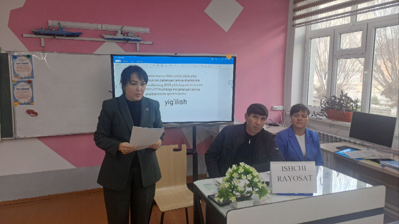Buxoro tuman ixtisoslashtirilgan maktabida 2023–2025 yillarga mo‘ljallangan jamoa shartnomasining 2025 yildagi ijrosi tanqidiy-tahliliy ruhda ko‘rib chiqildi. Yig‘ilishda maktab direktori D. Allanazarova tomonidan mehnat sharoitlarini yaxshilash, xodimlarni ijtimoiy qo‘llab-quvvatlash va jamoada barqaror muhitni ta’minlash borasida amalga oshirilgan ishlar yuzasidan hisobot berildi. Boshlang‘ich kasaba uyushmasi raisi M. Ro‘zieva esa jamoa a’zolarining huquq va manfaatlarini himoya qilish, shartnoma bandlari ijrosini ta’minlash hamda ijtimoiy sheriklikni mustahkamlash bo‘yicha olib borilgan faoliyat haqida axborot taqdim etdi.